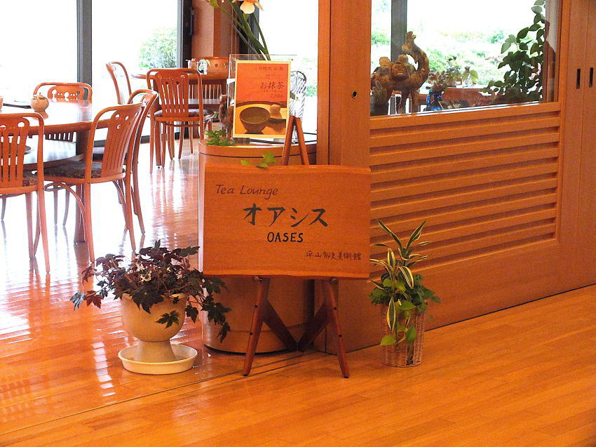 館内にはティーラウンジ「OASES」があって、そこからの庭の眺めは最高の癒し空間がひろがっていた。TOP画像の庭園は「OASES」内からの撮影だ。それとは別に、美術館内に入るまでの正門からL字形に歩いてゆく長くて幅広いグレーの石畳風の道の両脇には、さまざまな花を咲かせる緑の植込みが配してあって、右手には土色の漆喰塗り壁ふうの塀が、左手には真垣代わりなのか、娑婆の喧噪を遮るかのようにいろんな樹木があった。芸術や寺院などの自ずの世界観を守るために、世俗の喧噪からいかに隔絶したらよいか、借景や工夫には今も努力が尽きないものである。