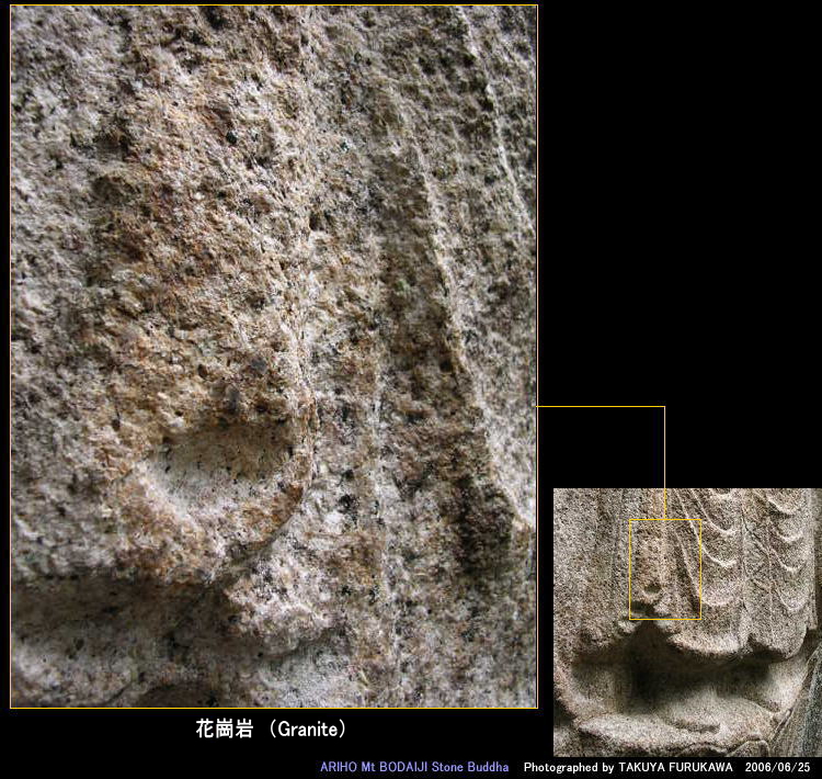 花崗岩の石仏制作は白鳳時代と奈良時代に見られるものの、一旦、時を隔てて、宋の渡来系石工の伊行末から派生し始める鎌倉時代まで待たねばならない。鎌倉時代以降に再び保存性のよい花崗岩の石仏が注目を浴びて各地に造像されるようになる。石質として丸彫りなどの彫りやすいのは、軟質な凝灰岩や砂岩ということになり、九州の臼杵石仏群や熊野磨崖仏などはその一例である。軟質だと岩窟や天蓋などで守らなければ石仏が崩れやすい弱点もある。ただ、石仏にも彫り方があって、線刻仏であれば花崗岩であっても比較的彫りやすかったのではなかろうか。しかも、かなり繊細なところまで表現できたであろう。京都の笠置寺虚空蔵石線刻磨崖仏などは、その代表例といえる。花崗岩にして平安後期のものとされ、高さは12m余りの線刻巨像だ。写真で見る限り、その格調ある流麗な菩薩像には圧巻がありそうだ。